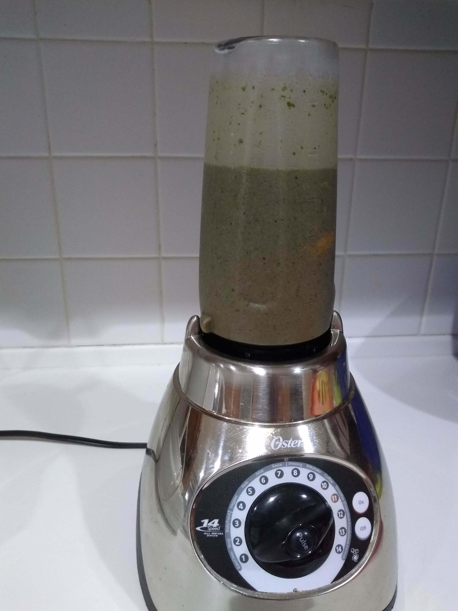 Ingredients: Silk coconut milk, about 1/2 – 3/4 cup frozen blueberries, about 1 cup frozen banana, 1/2 small a handful of spinach cocoa powder, 1 T. cinnamon, 1 T. almond butter, 2 T. Blend it all together until it is smooth.